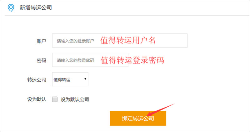 2、点击“新增转运公司”,填写账号与密码。需要注意的是:这里的用户名是指值得转运会员中心,头像下方的那个用户名,密码也为登录转运中心的密码,正确的填写才能绑定成功。