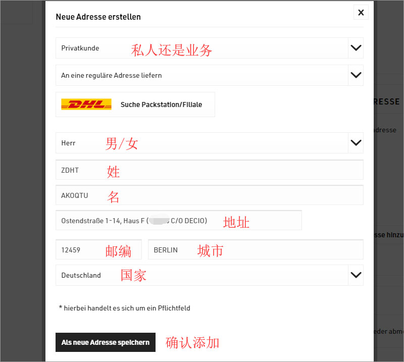 个人资料填写完成后,拉到页面的下方,进行个人地址的填写,然后完成注册。需要注意的是,这里的地址应该填写德国退税账单地址,具体可在“采购与退税”网站中查看地址;